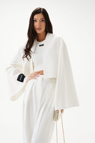 Платье женское полуприлегающего силуэта, выполнено из трикотажного полотна с фактурной лицевой стороной «люрекс». Модель на трикотажной подкладке, с плечевыми накладками. На правой части переда, вдоль отрезного пояса, заложены косые односторонние складки; детали лифа и юбки скреплены на запах. Низ платья асимметричный: правая часть переда удлинена к центру и оформлена углом, левая -- скругленная и входит в правый боковой шов. На спинке обработаны талиевые вытачки. В левом боковом шве предусмотрена застежка на потайную тесьму-«молнию» (35 см). Рукав длиной 3/4, втачной. Платье дополнено съемным «цветком» из основного полотна. Длина платья-108 см; длина рукава-41 см.