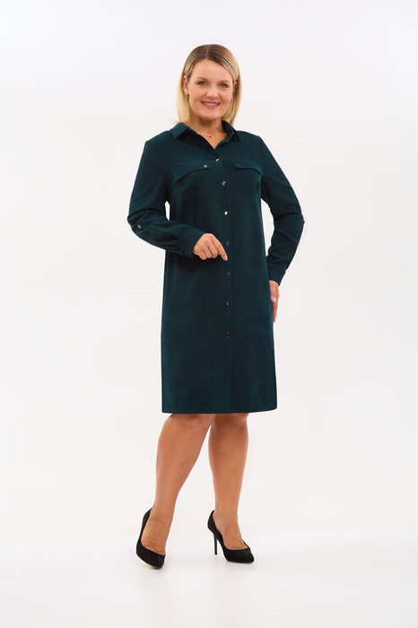 Повседневное женское платье  рубашка из вельвета -это сочетание стиля, строгости и утончённости. Спинка со средним швом и разрезами по низу. Универсальное и практичное платье длиной ниже колена, которая будет уместна для любого случая. По переду платья есть нагрудные выточки от пройм и настроченный  клапан, который украшен декоративными пуговицами.Также есть карманы в боковых швах.  Рукав втачной, длинный, по низу с манжетой и патами. В дополнении к платью идёт пояс . Застёжка спереди на петли и пуговицы на цельнокроеных планках и стояче -отложным воротником на отрезной стойке. Этот вариант вельветового осеннего платья идеален для  женщин любого возраста и  подходит для любого повода: как деловое на работу, в офис, как нарядное.  Женское платье  рубашка из штрукса - это отличная базовая модель, которая должна быть в гардеробе каждой девушки.
