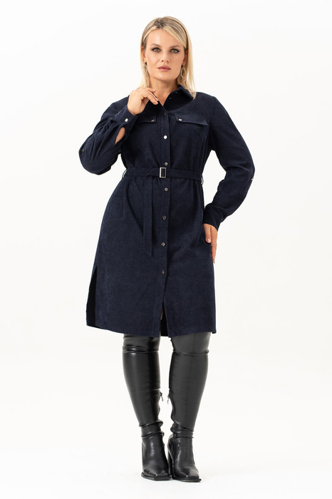 Повседневное женское платье  рубашка из вельвета -это сочетание стиля, строгости и утончённости. Спинка со средним швом и разрезами по низу. Универсальное и практичное платье длиной ниже колена, которая будет уместна для любого случая. По переду платья есть нагрудные выточки от пройм и настроченный  клапан, который украшен декоративными пуговицами.Также есть карманы в боковых швах.  Рукав втачной, длинный, по низу с манжетой и патами. В дополнении к платью идёт пояс . Застёжка спереди на петли и пуговицы на цельнокроеных планках и стояче -отложным воротником на отрезной стойке. Этот вариант вельветового осеннего платья идеален для  женщин любого возраста и  подходит для любого повода: как деловое на работу, в офис, как нарядное.  Женское платье  рубашка из штрукса - это отличная базовая модель, которая должна быть в гардеробе каждой девушки.