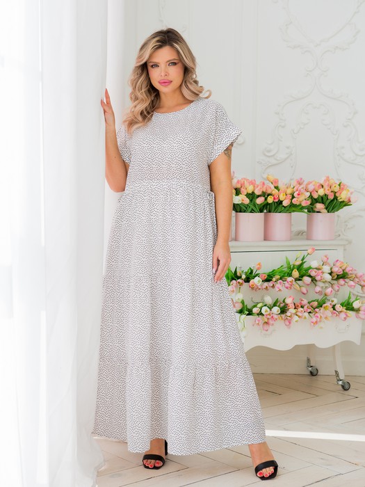 Повседневное летнее платье, свободного силуэта, длиной maxi, выполнено из шифона. Платье отрезное по линии талии. Верх платья с удлиненной линией плеча и небольшой цельнокроеной кокеткой переда и спинки по плечевому шву. Перед целый, спинка со средним швом. Пройма свободная заниженная, с притачными мягкими манжетами по низу. Круглый вырез горловины переда и спинки обработан обтачками. Юбка из 3х ярусов со сборкой по швам притачивания. По линии талии настрочная кулиска с завязками по бокам, которые позволяют регулировать свободу прилегания по фигуре. Платье без застежки, с подкладом по юбке. Длина изделия по спинке в 50 р-ре – 137 см. в 64 р-ре – 143 см.