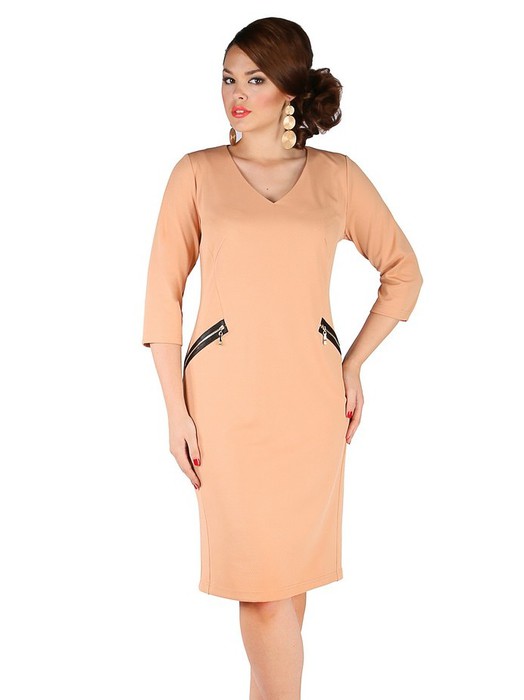 Элегантное платье полуприлегающего силуэта, выполнено из трикотажного полотна \"Фукра\". V-образный вырез горловины обработан обтачкой. Рукава втачные, длиной 3/4. Верхняя часть переда с рельефными швами, переходящими в декоративный элемент, имитирующий карманы на застежке-молнии. Спинка со средним швом и шлицей. Длина шлицы 20 см. Платье без подклада и застежек. Длина изделия по спинке в 50 р-ре 102 см.