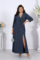Элегантное платье прямого силуэта, выполнено из эластичной плательной ткани Ниагара. По переду застрочена глубокая фигурная складка, образующая оригинальный волан. Фигуру можно подчеркнуть мягкими полупоясами с завязывающимися концами, расположенными в боковом шве и шве застрачивания складки переда. Спинка с двумя с вертикальными вытачками, средним швом и шлицей длиной 28 см. Круглый вырез горловины переда и спинки обработан обтачкой. Рукав втачной, прямой. Длина рукава от плечевой точки в 46 р-ре – 40 см., в 56 р-ре – 42 см., обхват рукава по низу в 46 р-ре – 26 см., в 56 р-ре – 32 см. Платье без подкалада и застежек. Длина по спинке в 46 р-ре – 102 см. в 56 р-ре – 104 см.