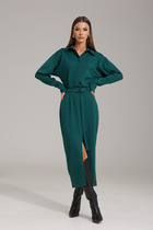 Платье полуприлегающего силуэта, со спущенным плечом, выполнено из трикотажного полотна, отрезное по талии. Верхняя часть переда и спинки более свободной формы. На переде расположена потайная планка на петли-пуговицы до подрезной линии. На левой детали переда в области груди расположена прорезная листочка – обманка. Воротник стояче-отложной с отрезной стойкой. В верхней части переда и спинки заложены односторонние складки, направленные к боковому шву. В нижней части переда расположен переходящий в разрез средний шов. На талии, по переду и спинке расположены вытачки. К платью прилагается пояс из основной ткани. Отделкой в данной модели служит фурнитура контрастного цвета.