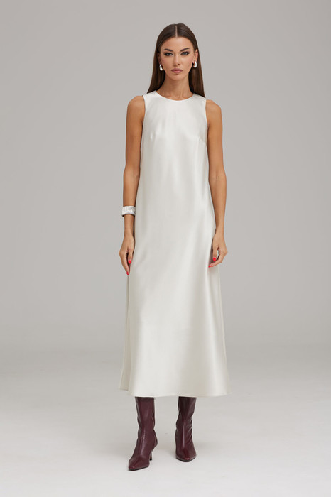 Платье с американской проймой, полуприлегающего силуэта. Платье выполнено из атласной струящейся ткани, покроено по косой. Горловина округлой формы, по спинке с застежкой на пуговицу. По переду расположены нагрудные вытачки, на спинке – талиевые вытачки. Платье с трикотажной подкладкой.