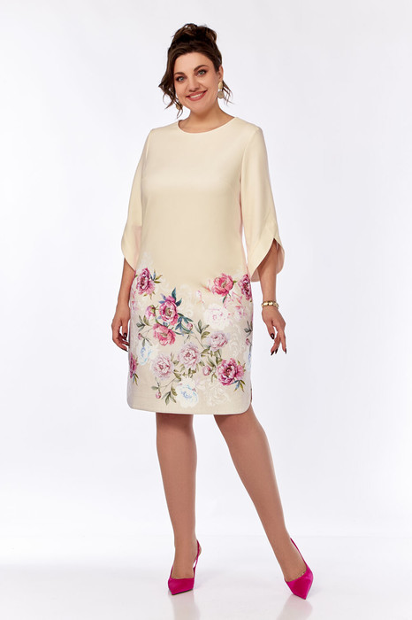 Нарядное  женское платье полуприлегающего силуэта с округлым вырезом горловины. Платье на подкладке, нижняя часть платья и рукава обработаны обтачкой. Платье из ткани с принтом  по низу. По спинке средний шов с потайной молнией.