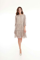 Платье женское полуприлегающего силуэта, с застежкой на петли-пуговицы до волана. По переду фигурный вырез и по два вертикальных рельефа, переходящих во встречные складки. Спинка с талиевыми вытачками, между которыми настрочена резинка. К платью пришиты два волана со сборкой, нижний имеет фигурный низ. Рукав втачной, короткий.