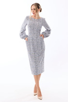 Роскошное платье свободного силуэта из атласа серого цвета. Платье с отложным воотником, по переду изделия выполнена планка с застежкой на пуговицы. По низу втачных рукавов декоративная тесьма с "перьями". По бокам изделия - разрезы. Длина изделия по спинке от плечевого шва до низа изделия — 108 см. Рост фотомодели — 170 см.