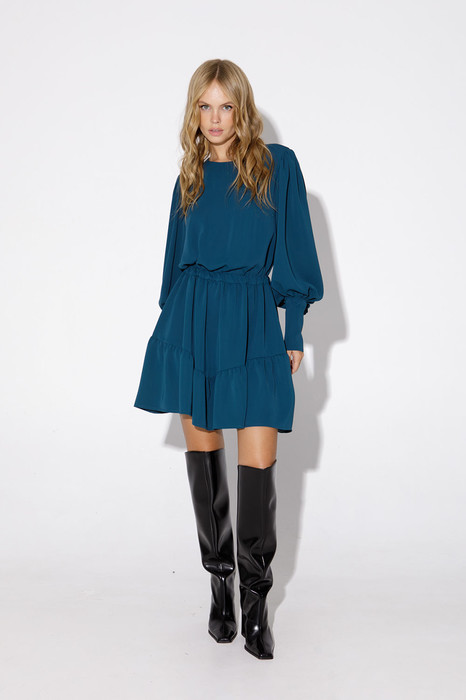 Платье полуприлегающего силуэта из текстильной ткани с принтом. Детали: отрезная линия талии на резинке, круглый вырез горловины, широкие втачные рукава со сборкой и высокими манжетами, застежка на навесную петлю и пуговицу в среднем шве спинки, юбка платья фигурной формы с притачной широкой оборкой.