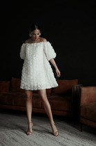 Детали: фигурный вырез горловины переда и спинки, отрезная линия талии с резинкой, цельнокроеные свободные рукава