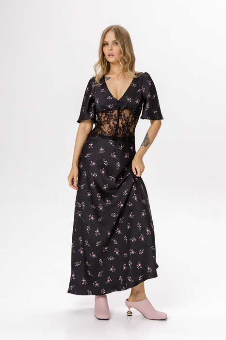 Детали: прилегающий силуэт, глубокий V-образный вырез, завышенная фигурная линия талии, лиф со сборкой, потайная молния в боковом шве, короткие рукава со сборкой по окату, лиф и юбка платья на подкладке 100% вискоза, декоративные пуговицы по переду.
