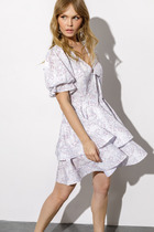 Детали: полуприлегающий силуэт, отрезное по линии талии, V-образный вырез, лиф переда с рельефами, спинка с фигурным вырезом и завязками, короткие пышные рукава, застёжка на потайную молнию в среднем шве спинки, платье на подкладке.