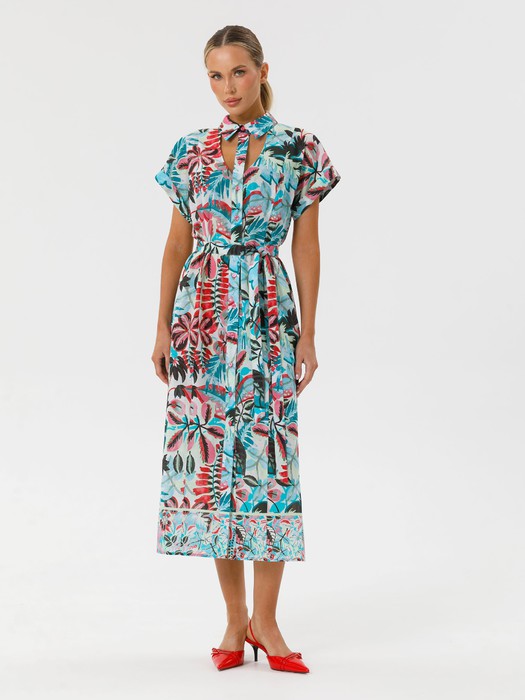 Модель полуприлегающего силуэта, с рельефамии, без подклада. Спереди планка с застёжкой на петли и пуговицы. По низу цельнокроеного рукава обработана отложная манжета. Воротник сорочечный. В боковых швах высокие разрезы. Талия подчёркнута съёмным завязывающимся поясом из основной ткани.