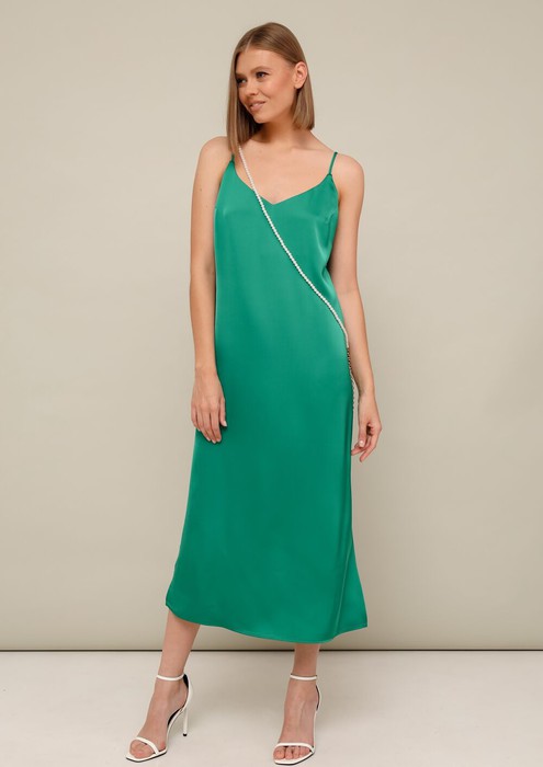 из струящейся ткани с благородным матовым блеском. Перед с нагрудными вытачками. В боковых швах по низу обработаны высокие разрезы. Бретели регулируются по длине. В комплекте к платью прилагается жемчужная цепочка. Платье без подкладки.