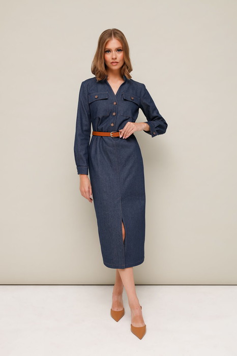 Женское платье полуприлегающего силуэта, отрезное по линии талии, выполнено из джинсовой ткани. Vобразный вырез горловины с притачным воротником-стойкой. Лиф с центральной застежкой на петли, пуговицы и с накладными карманами с клапанами. Юбка с разрезом в среднем шве, который обеспечивает свободу движения. Рукава втачные с притачной манжетой с застежкой на пуговицы. Спинка с талиевыми вытачками. В комплекте прилагается ремень