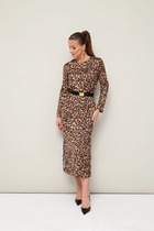 Вечернее платье полуприлегающего силуэта, выполнено из струящейся ткани с благородным матовым блеском. Горловина округлой формы. В области талии заложены складки, плавно переходящие в драпировку. Рукава втачные длинные. Застежка в среднем шве спинки на тесьму молнию. Для удобства движения сзади обработан разрез.