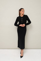 Платье из шифона с абстрактным принтом, отрезное выше линии талии. Горловина округлой формы. Лиф платья с застежкой на притачные планки с петлями и пуговицами. Нижняя часть платья с притачным воланом со сборкой. Рукава длинные втачные на резинке в области запястья. В комплекте прилагается нижнее платье-комбинация на регулируемых бретелях.