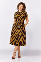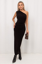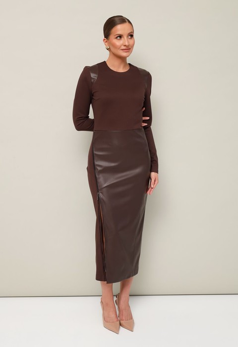 Стильное платье прилегающего силуэта, отрезное по линии талии, выполнено из экокожи и трикотажного полотна. Горловина округлой формы. Длинные втачные рукава. Юбка спереди с подрезом на металлическую молнию, с возможностью регулировать высоту разреза. Застёжка по спинке в среднем шве на потайную молнию.