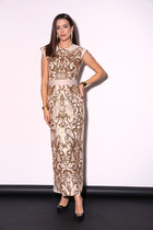 Платье полуприлегающего силуэта, отрезное по талии, выполнено из струящейся ткани с матовым блеском. V-образный вырез горловины. Спереди лифа обработан декоративный узел. Рукава короткие цельнокроеные. Спинка лифа со средним швом, по линии талии для комфорта обработана резинка. Крой юбки по косой.