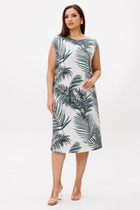 Легкое платье прямого силуэта. Округлая горловина на внутренней обтачке. Короткие цельнокроеные рукава, оканчиваются манжетами на отворотах. В среднем шве спинки расположен разрез с застежкой на пуговицу. Пояс из основного материала в комплекте. Низ ровный, без разрезов.
