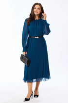Платье полуприлегающего силуэта, выполненное на запах, длиной до середины бедра. Платье отрезное по линии талии. Лиф спинки со средним швом и рельефами. Лиф переда с рельефами от пройм до подреза по талии. Юбка спинки со средним швом и талиевыми вытачками. Юбка переда ассиметричная: правый перед укорочен, левый перед удлинен. Воротник пиджачного типа. Рукава двушовные, втачные, длиной до локтя. Застежка по переду на петли и пуговицы. Платье на подкладке с плечевыми накладками.