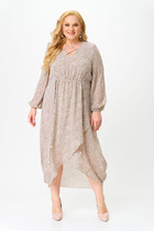 Платье женское расширенное книзу, длиной за колено, предназначено для повседневной носки. Перед с двумя нагрудными вытачками, с двумя прорезными карманами с листочками, с втачными концами на уровне линии бедер, со средним швом, вверху с разрезом, фиксирующимся пришивным украшением с двумя пробивными хольнитенами. Спинка со средним швом. Застежка на потайную тесьму-молнию в среднем шве спинки. Горловина круглая, обтачная, без воротника. Рукав втачной, двух шовный, короткий. Внизу верхнего рукава пата, фиксирующаяся в две настрочные шлевки. Пата с шестью пробивными хольнитенами. Платье с плечевыми накладками. Длина спинки 101 см.