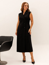 Платье женское отрезное по линии талии, длиной ниже колена, предназначено для повседневной носки. Верхняя часть переда с двумя нагрудными вытачками, с двумя односторонними зафиксированными складками справа, со средним швом с односторонней зафиксированной складкой, с цельнокроеной отлетной баской, с фигурным настрочным клапаном слева. Складка среднего шва декорируется 4-мя большими и 4-мя маленькими декоративными пуговицами. Нижняя часть переда с легкой сборкой по верхнему срезу. Верхняя часть спинки с двумя талиевыми вытачками, верхний срез нижней части спинки с легкой сборкой, расположенной между вытачками верхней части. В боковых швах платья обработаны карманы. Горловина круглая, обтачная, без воротника. Рукав втачной, короткий, одно шовный. Платье на хлопковой подкладке. Платье с плечевыми накладками. Длина спинки 115 см. Длина рукава 28 см