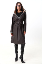 Платье женское относится к нарядной торжественной одежде. Платье женское полу прилегающего силуэта, длиной за колено. Перед с 2-мя нагрудными вытачками. Спинка с 2-мя талиевыми вытачками и средним швом, заканчивающимся шлицей. Горловина круглая, обточная, без воротника. Платье со спущенным плечом. Рукав втачной, одно шовный, длиной 7/8 из отделочной ткани; низ рукава собран на эластичную тесьму; окат рукава с 4-мя односторонними складками и 1-оё встречной по центру. Платье на подкладке. Платье без плечевых накладок. Длина спинки 107 см, длина рукава 43 см, длина рукава от горловины 60 см.