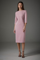 Платье женское предназанеченное для повседневной носки. Платье женское отрезное по линии талии, длиной до нижней части икры. Верхняя часть переда с 2-мя нагрудными вытачками, с 2-мя притачными планками по центру зафиксированы между собой 2-мя пришивными бусинами, нижняя часть переда с лёгкой сборкой по верхнему срезу. Верхняя часть спинки-цельнокроенная, нижняя-цельнокроенная с лёгкой сборкой по верхнему срезу. Низ платья с притачным воланом с лёгкой сборкой по верхнему срезу. Горловина фигурная, обточная, без воротника. Рукав втачной, одношовный, длиной до локтя с приточным воланом по низу с лёгкой сборкой по верхнему срезу. Верхняя часть переда на подкладке. Платье с плечевыми накладками. Длина спинки 126 см, длина рукава 33 см.