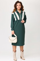 Платье предназначено для повседневной носки. Платье женское, полу прилегающего силуэта, длиной ниже колена. Верхняя часть платья (лиф)отлётная с фигурным низом "ступенька". Верхняя часть переда с 2-мя отрезными бочками. Верхняя часть спинки с 2-мя таллиевыми вытачками. Нижняя часть платья (юбки) из отделочной ткани. Нижняя часть переда с 2-мя таллиевыми вытачками. Нижняя часть спинки с 2-мя таллиевыми вытачками и средним швом, заканчивающимся шлицей. Горловина круглая с отрезной планкой, шов втачивания планки декорирован притачным кантом. Рукав втачной, одно шовный, длинный. Платье с плечевыми накладками. Длина спинки 110 см, длина рукава 57 см.