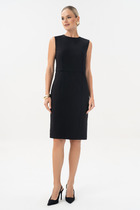 Платье женское, предназначено для повседневной носки. Платье женское А-силуэта, длиной за колено. Перед с 2-мя нагрудными вытачками, с надстрочной вертикальной планкой, декорированной 3-мя пришивными пуговицами, с отрезной притачной планкой по горловине, шов притачивания декорирован отделочной тесьмой с бусинами. Спинка с 2-мя таллиевыми вытачками и средним швом. Платье с карманами в боковых швах. Горловина круглая, обточная, без воротника. Застёжка на потайную тесьму-молнию в среднем шве спинки. Рукав втачной, 2х шовный, длиной 3/4. Платье на подкладке. Платье с плечевыми накладками. Длина спинки платья 98 см. Длина рукава 48 см.
