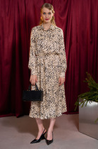 Платье женское, предназначено для повседневной носки. Платье женское отрезное по линии талии, слегка расширенное к низу, длиной до серединны икры. Верхняя часть переда с 2-мя нагрудными вытачками, с 2-мя вертикальными притачными планками, с 7-мью декоративными защипами шириной 0,3 см (с каждой стороны; нижняя часть переда с лёгкой сборкой по верхнему срезу по бокам). Верхняя часть спинки цельнокроеная; нижняя часть спинки с лёгкой сборкой по верхнему срезу. Платье с втачным поясом по линии талии с обработанной по ним кулисой с завязками с металлическими наконечниками. Горловина круглая с втачной стойкой. Застёжка центральная на верхней части переда на 5-ть вертикально обмётанных петель и 5-ть пришивных пуговиц. Рукав втачной, одно шовный длинный со сборкой и притачной манжетой, с застёжкой на обмётанную петлю и пришивную пуговицу. Платье на подкладке. Платье с плечевыми накладками. Длина спинки платья 126 см. Длина рукава 59 см.