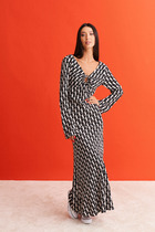Платье женское относится к нарядной торжественной одежде. Платье женское отрезное по линии талии, расширенное к низу, длинное. Верхняя часть переда с 2-мя нагрудными вытачками, нижняя часть цельнокроеная. Верхняя часть спинки с 2-мя таллиевыми вытачками, с обработанным разрезом по головине, фиксирующимся на 1-ну навесную петлю и 1-ну пришивную пуговицу; нижняя часть спинки цельнокроеная. Горловина круглая, обточная, без воротника. Рукав втачной одно шовный, длинный. Рукав со сборкой по окату. Низ рукава собран на эластичную тесьму. Платье на подкладке. Платье без плечевых накладок. К платью прилагается съёмный пояс. Длина спинки платья 137 см, длина рукава 55 см.