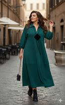 Платье женское относится к нарядной торжественной одежде, но может использовано и при повседневной носке. Платье женское, отрезное по линии талии, расширенное к низу, длиной за колено. Верхняя часть переда с отрезными рельефами, выходящими из плечевых швов, центральная часть с зафиксированным запахом. Верхняя часть спинки со средним швом и 2-мя рельефами, выходящими из плечевых швов. Горловина с V-образным вырезом, фигурная, обточная без воротника. Нижняя часть переда и нижняя часть спинки цельнокроеные, выполнены из отделочной ткани. Шов соединения верхней и нижней частей платья декорирован притачной фигурной отлетной баской. Платье с декоративным поясом из отделочной ткани, закреплённом на левом боковом шве и фиксирующимся в бант через металлическую пробивную блочку на центральной части переда. Рукав одно шовный втачной, длиной до локтя, с притачной фигурной манжетой. Платье с плечевыми накладками. Нижняя часть на подкладке. Длина платья 112 см, длина рукава 33 см.