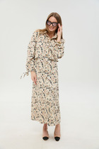 Платье женское, относится к нарядной торжественной одежде. Платье пончо свободного кроя, длинное. Перед цельнокроеный. Спинка со средним швом, вверху с разрезом, фиксирующимся по горловине на 1-ну навесную петлю и 1-ну пришивную пуговицу. Горловина круглая, обточная, без воротника, по переду горловины отделочная строчка 0,6 см. Рукав цельнокроеный удлинённый. Низ рукава и боковые швы декорированы приточной оборкой. По боковым швам зафиксирован уровень пройм и место расположения петель на уровне линии талии отделочными строчками. К платью прилагается съёмный пояс с пряжкой, фиксируемые на платье в петли на уровне линии талии. Платье без плечевых накладок. Длина спинки платья 132 см, ширина на уровне глубины проймы 66 см, ширина по линии талии 66 см, ширина плеча+длина рукава 56,5 см.