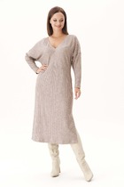 Платье относится к торжественно-нарядной одежде. Платье женское, полу прилегающего силуэта, длиной за колено. Перед с 2-мя рельефами, выходящими из плечевых швов и средним швом. Спинка с 2-мя таллиевыми вытачками и средним швом, заканчивающимся шлицей. Застёжка на потайную тесьму молнией в среднем шве спинки. Горловина круглая, обточная, без воротника с V-образным разрезом по переду, декорированным отделочной планкой, с пришивной стразой. Рукав во втачной, 2-х шовный, длиной 3/4. Платье на подкладке. Платье с плечевыми накладками. Длина платья по спинке 103 см, длина рукава 43,5 см.