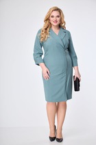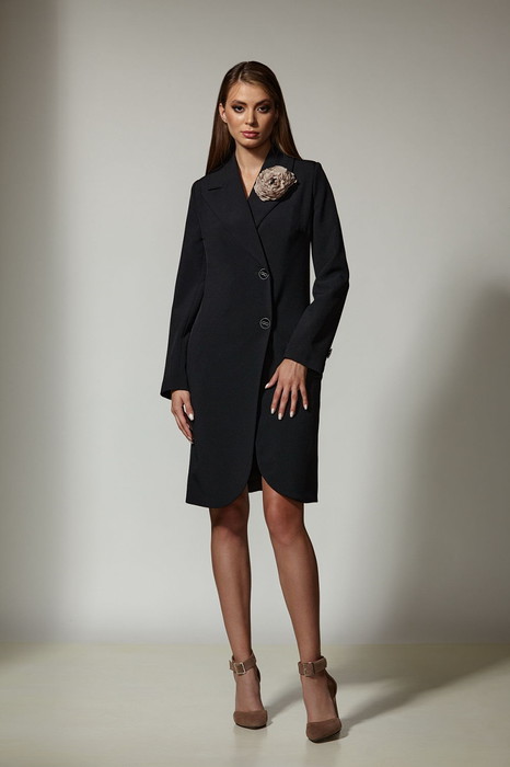 Двубортное платье из костюмной ткани на подкладке. По переду платья - нагрудные вытачки, по спинке - рельефы. Бочки, смещенные к переду, делают удобным расположение карманов в швах. Воротник - отложными лацканами пиджачного типа. Рукава - двухшовные, длинные, со шлицей и 2 пуговицами. Жакет застегивается на 2 основные пуговицы, 1 потайную. Платье украшает цветок ручной работы.