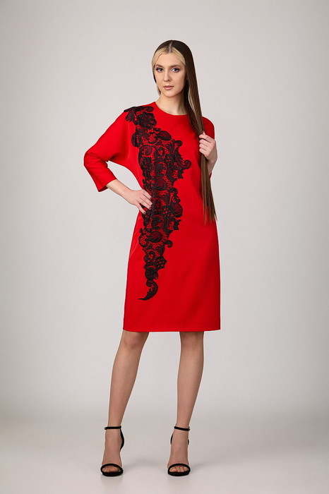 Платье из стрейчевой плательной ткани. Крой «летучая мышь» подойдет для любого типа фигуры и подчеркнет ее достоинства. Изюминка платья - роскошная нашивка из черного кружева. Застежка-молния в среднем шве спинки. Рукава  трехчетвертные.
