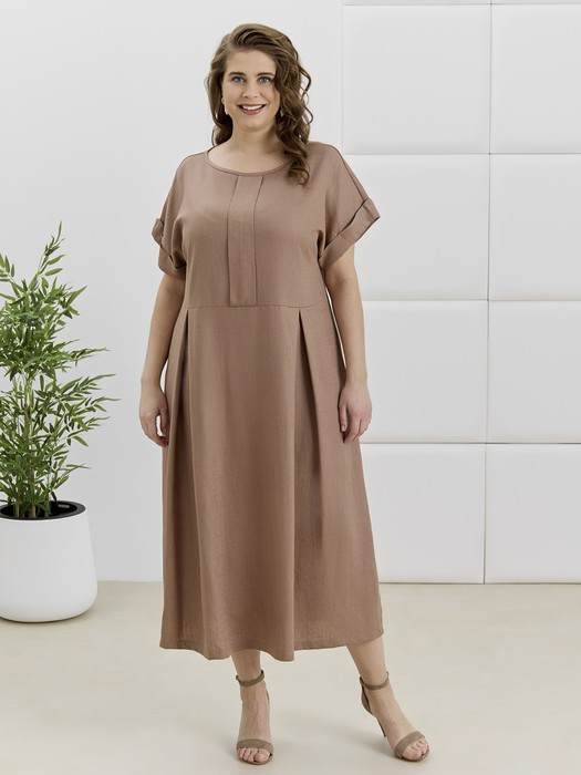 Платье женское из гладкокрашеной плательной ткани, отрезное по линии талии, расширенное книзу, с короткими цельнокроеными рукавами, обработанными манжетами. По центру полочки выполнена декоративная планка, по соединительном шву лифа и юбки заложены встречные складки.