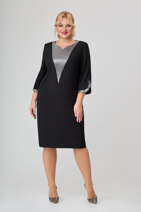 Элегантное платье полуприлегающего силуэта из текстильной ткани, длиной чуть ниже колена. Перед c V – образной вставкой из отделочной ткани. Вырез горловины фигурный. В боковых швах карманы. Рукав длиной 3/4, втачной, с фигурным низом и элементами из отделочной ткани. В среднем шве спинки потайная молния и разрез. Платье станет идеальным вариантом к любому случаю.