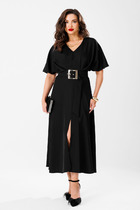 Платье женское прямого силуэта со спущенной линией плеча. Застежка центральная на 8 петель и пуговиц. Воротник отложной на стойке. По верхней части спинки кокетка, нижняя часть спинки со встречной складкой. В боковых швах карманы. По линии талии пояс в тон ткани. Низ рукава с манжетой и декоративной патой. Платье с фигурной линией низа и разрезами.