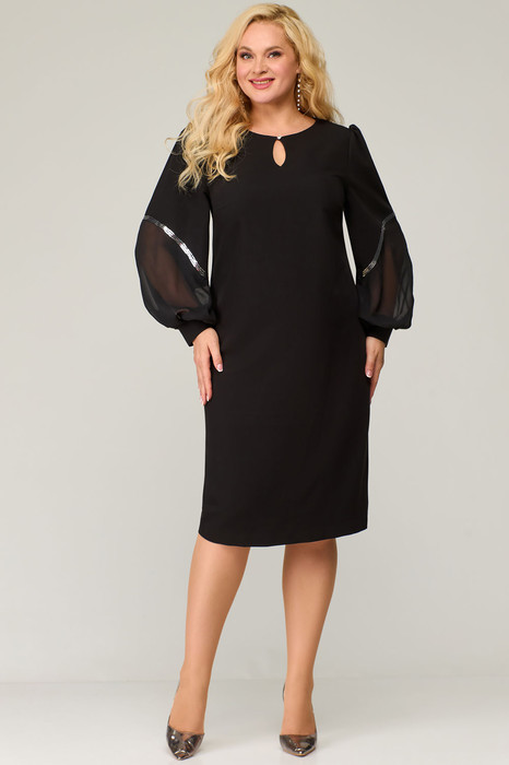 Платье женское полуприлегающего силуэта, слегка зауженное к низу с втачным рукавом. Горловина округлой формы с застежкой капелькой по переду. По линии груди переда вытачки. Спинка со средним швом и разрезом по низу. Рукав объемной формы состоит из двух деталей и декорирован тесьмой из пайеток. В верхней части рукава сборка. Нижний срез рукава присборен и обработан притачной манжетой с застежкой на петлю и пуговицу.