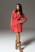 Платье женское прямого силуэта длины миди, с втачным рукавом. Горловина с цельнокроеным воротником стойкой. По горловине и талии вытачки. По переду декоративная планка. Рукав длинный с декоративной планкой из пайеток. По спинке средний шов и потайная застежка молния. В левом боковом шве разрез.