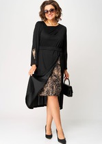Платье из мягкой вискозно-льняной ткани полуприлегающего силуэта. По переду обработаны нагрудные вытачки и планка до линии груди, застёгивающаяся на 4 петли и 4 декоративные металлические пуговицы. По переду платья расположены два нагрудных клапана с пуговицами. Воротник рубашечный с отрезной стойкой. Рукав цельнокроеный, короткий, спущенный с отложной манжетой по низу. В комплекте пояс из основной ткани.