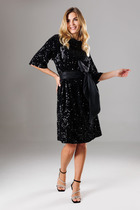 Платье Х-силуэта длиной миди, выполнено из шифона на трикотажной подкладке. Лиф отрезной по линии талии. Перед и спинка лифа цельнокроеные. Нижняя часть платья клешеная. Талия регулируется резинкой. Подкладка верхней части платья на бретелях. Рукав длинный втачной. По низу рукава сборка и притачная манжета, застёгивающаяся на 2 петли и пуговицы. Горловина округлой формы, по центру переда капелька с завязкой.