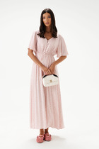 Платье отрезное ниже линии талии.  Верхняя часть выполнена из однотонного полотна, нижняя часть – с дизайном «гусиная лапка».