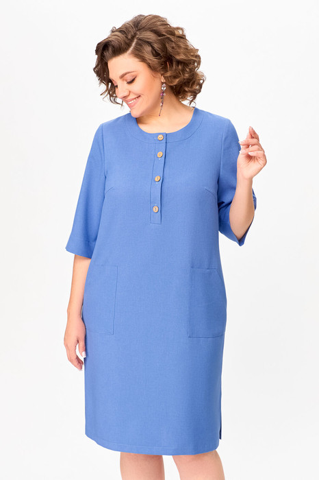 Платье прямого силуэта из  вискозно-льняной ткани, полочка с планкой , застегивающейся на петли и декоративные пуговицы, с нагрудными выточками и накладными фигурными  карманами в области бёдер, горловина круглая, обработана притачной  обтачкой, рукав втачной, одношовный, длиной ниже локтя. В боковых швах разрезы длиной 20 см.