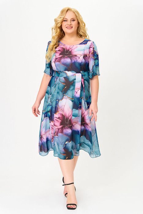 Платье полуприлегающего силуэта из мягкой шифоновой ткани на трикотажной подкладке. Полочка с отрезными рельефами, спинка с центральным швом и рельефами. Горловина округлой формы. Рукав втачной, формы «колокол», по окату с лёгкой сборкой, длиной 34 см.