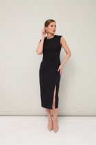 Платье из струящейся вискозной ткани, отрезное по линии талии. Лиф полуприлегающего силуэта. По полочке лифа центральный шов, нагрудные и талиевые вытачки, по спинке средний шов и талиевые вытачки. Горловина V-образной формы с отложным воротничком из отделочной ткани. Юбка расклешенная. Рукав втачной короткий, формы «тюльпан». В среднем шве спинки застёжка на потайную тесьму-молнию.
