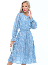 Платье из шифона на трикотажной подкладке, Х-образного силуэта с полуприлегающим лифом. Платье отрезное по линии талии. По переду лифа расположены рельефы, по спинке лифа талиевые выточки. Юбка расклешенная из шести клиньев со встречными складками по линии талии. В среднем шве спинки предусмотрена потайная тесьма- молния. Рукав втачной покроя тюльпан, длина рукава 15 см.