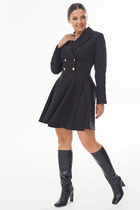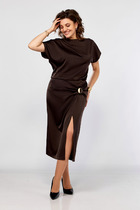 Лиф полочки с нагрудными выточками и округлым вырезом горловины, лиф спинки с центральным швом и V-образным вырезом горловины. Юбка состоит из передней и задней  деталей с цельнокроенными планками по бокам, которые скреплены декоративными пуговицами. Рукав втачной, короткий длиной – 28 см.